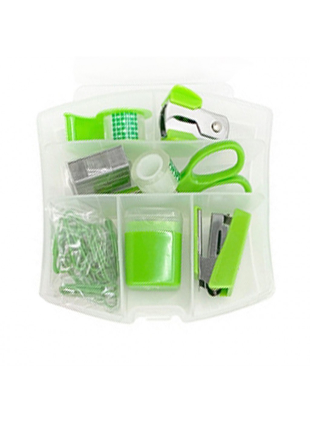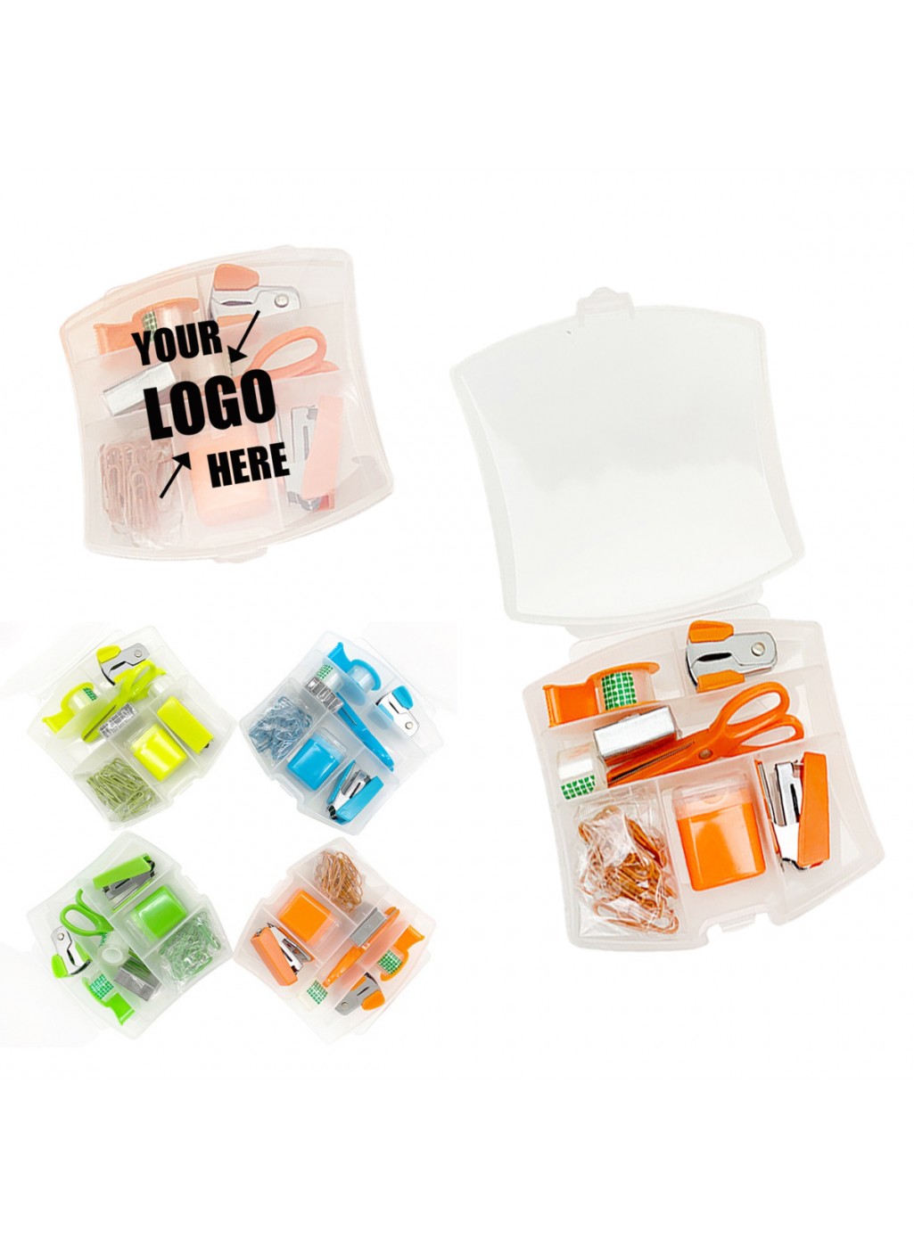 This compact and colorful mini stapler set is both practical and visually appealing. Designed for the office, home, or classroom, it includes essential desk tools: a stapler with extra staples, clips, a tape dispenser, a pencil sharpener, and scissors, all housed in a translucent plastic case. Available in orange, blue, green, and yellow, the set offers a large imprint area, making it an excellent promotional item. Customize the lid with your logo to promote schools, businesses, or events, offering recipients a functional and stylish desktop solution.